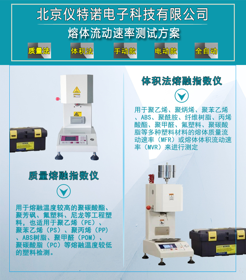 用于測定各種塑料、樹脂聚合物在粘流狀態時熔體質量率流動速率MFR值,既適用于熔融溫度較高的聚碳酸酯、聚芳砜、氟塑料、尼龍等工程塑料,也適用于聚乙烯(PE)、聚苯乙烯(PS)、聚丙烯(PP)、ABS樹脂、聚甲醛(POM)、聚碳酸酯(PC)樹脂等熔融溫度較低的塑料測試。